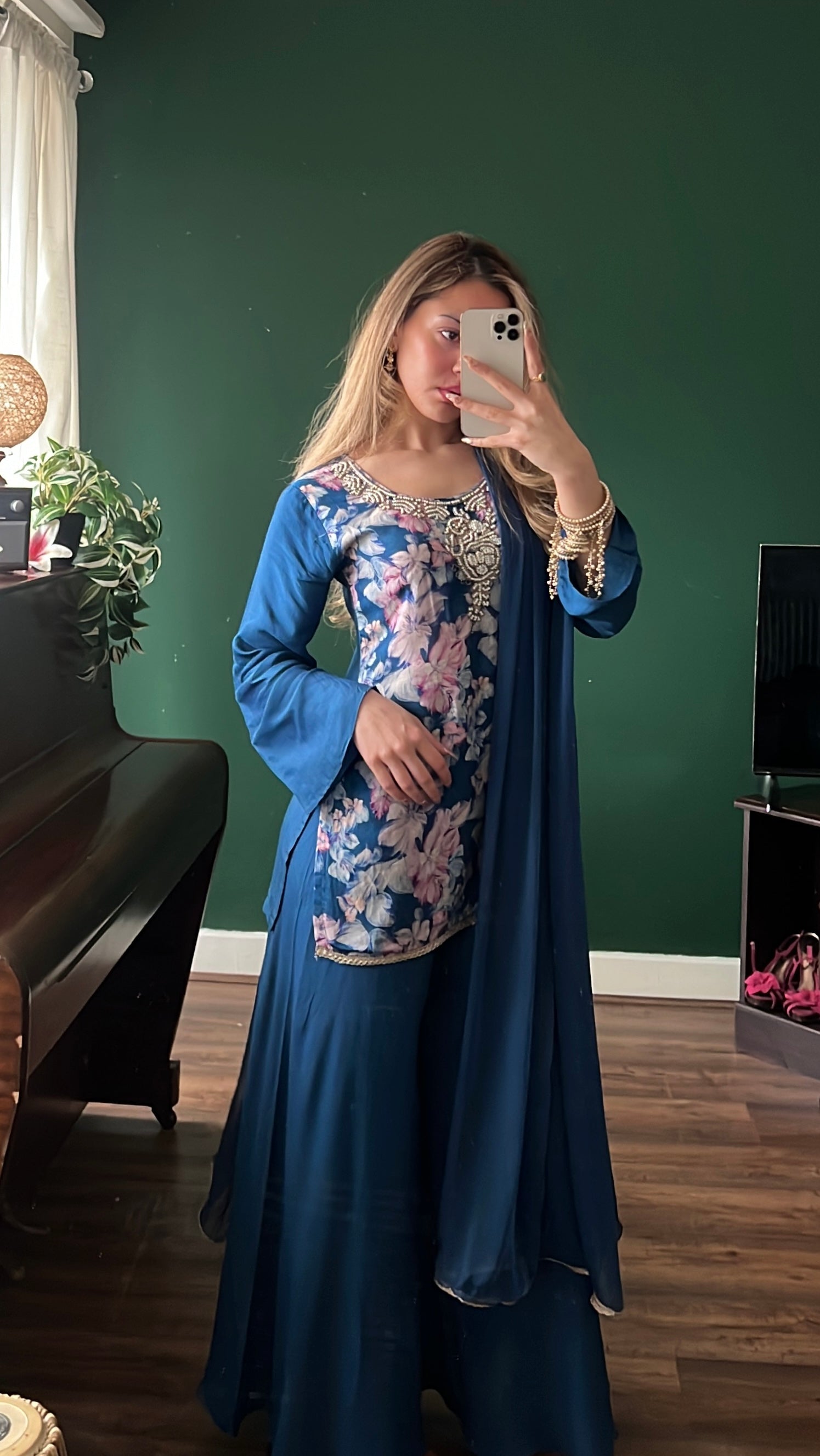 A rich floral kurta in soft modal cotton with pearl embroidery on the neckline and elegant bell sleeves, paired with a sharara and a dupatta finished with golden lace. Available in green, blue, red and yellow.